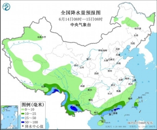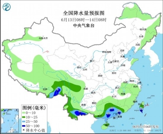 6月13日08時(shí)至14日08時(shí),云南南部、廣西南部和東部、廣東大部、臺(tái)灣島中南部、西藏東南部等地有大雨,局部地區(qū)有暴雨(50~90毫米)。新疆東部等地有5~6級(jí)風(fēng)(見圖3)。