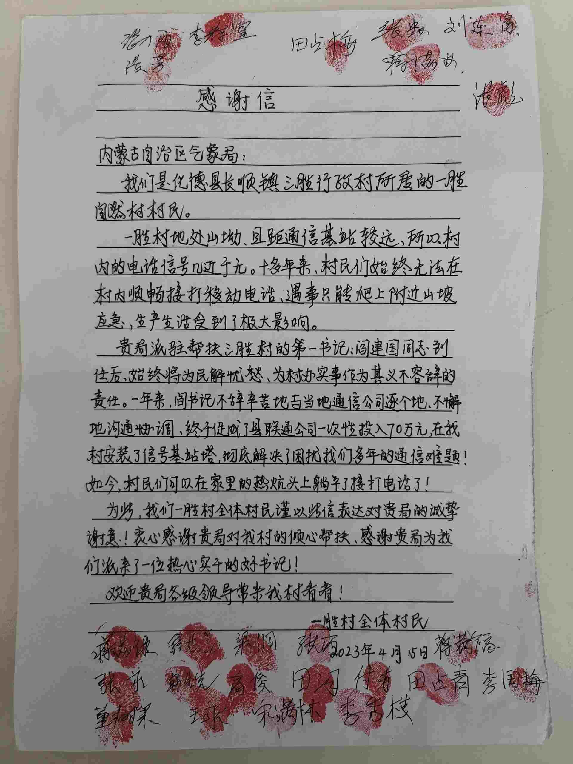 近日,一封署名為“一勝村全體村民”的感謝信,被專程送至內(nèi)蒙古氣象局,信紙上的空白處簽滿了24個(gè)名字,還有一枚枚鮮紅的指印,這封信承載著烏蘭察布市化德縣一勝村16戶村民對(duì)駐村第一書記閻建國的誠摯謝意。