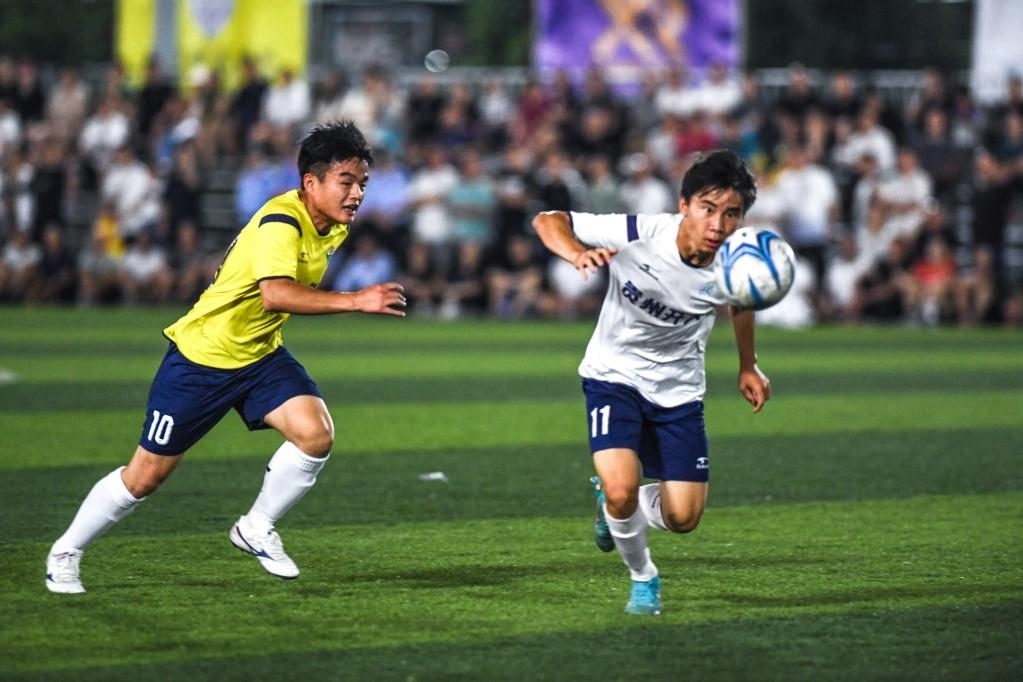 6月9日,貴州開放大學足球隊球員與榕江足球代表隊球員(左)在友誼賽中拼搶。新華社記者 楊文斌 攝