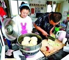 長(zhǎng)城文保員郝中華(右)和妻子霍春玲在家中準(zhǔn)備午飯。齊波攝