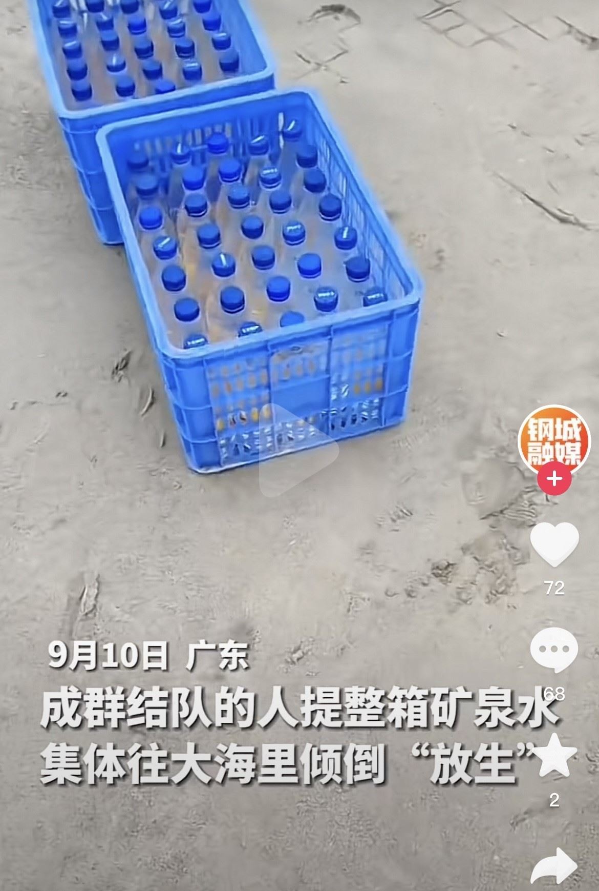 近日,有網(wǎng)友在社交平臺發(fā)布稱,廣東汕尾湖東港有一群人往海里“放生”礦泉水,60多箱礦泉水被浪費。現(xiàn)場視頻顯示,一群人抬著藍(lán)色的箱子正往海邊走,箱子里可見擺放整齊的礦泉水瓶。視頻發(fā)布者介紹,9月10日下午3點多來了兩輛大巴,大巴上坐滿了人。