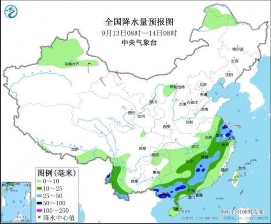 9月13日08時至14日08時,江淮東部、江南中東部和南部、云南西部、華南大部等地部分地區(qū)有中到大雨,其中,江蘇中南部、上海北部、江西中南部、云南西部、廣西南部和東部、廣東西部等地部分地區(qū)有暴雨或大暴雨(100~150毫米)。甘肅河西部分地區(qū)有4~6級風(fēng),其中,新疆東部部分地區(qū)有7~8級風(fēng)。