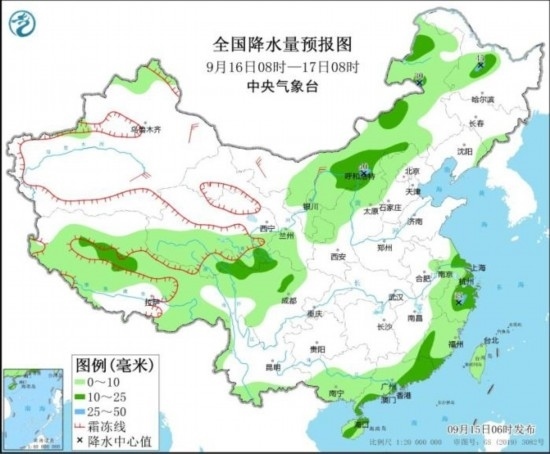 9月16日08時至17日08時,內(nèi)蒙古中東部、新疆北疆北部、西藏大部、青海中南部、甘肅西南部、寧夏中東部、陜西北部、陜西北部、河北西北部、四川西北部、云南西部和南部、江蘇東部和南部、上海、浙江、福建、江西東北部和南部、廣東大部、廣西中南部、海南島、臺灣島等地部分地區(qū)有小到中雨,其中,內(nèi)蒙古中部和東北部、黑龍江西部、浙江中北部等地局地有大雨(25~45毫米)。內(nèi)蒙古西部、新疆南疆盆地和東部等地部分地區(qū)有4~6級風。