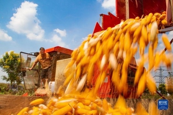 9月14日,農(nóng)民駕駛農(nóng)機在河南省駐馬店市汝南縣羅店鎮(zhèn)袁莊村收獲成熟的玉米。