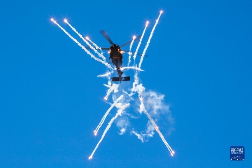在第六屆中國天津國際直升機博覽會開幕式上,陸軍“風雷”飛行表演隊直-20戰(zhàn)術通用直升機發(fā)射干擾彈。?