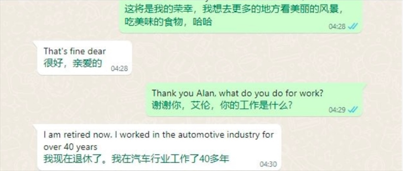 這個過程被他們稱為“切客”。張先生說,他們一般會通過分享新聞將對話引導(dǎo)到經(jīng)濟(jì)狀況的話題,然后進(jìn)一步觀察對方有沒有投資的興趣。“如果他反應(yīng)很好的話,就直接引導(dǎo)他去投資,如果不好就繼續(xù)聊感情?!?/p>