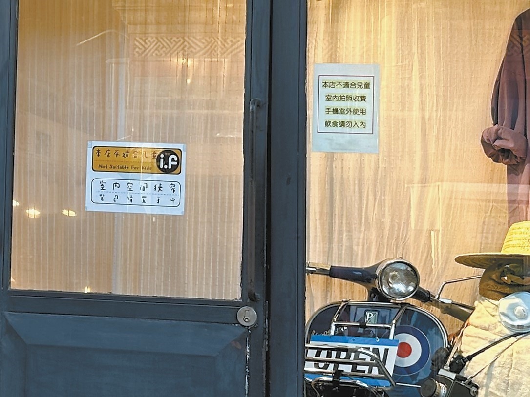 五道營胡同的一家服飾店,雖然門上貼著“本店不適合小孩”的提示,但兒童也可以進(jìn)店。