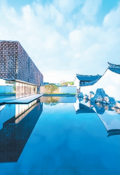 圖書館前立著一面照壁,壁上刻有蔡元培題詩(shī),表達(dá)對(duì)故鄉(xiāng)的眷戀。繞過(guò)照壁,一片方形水景映入眼簾,水中點(diǎn)綴山石,水畔一側(cè)是蔡元培故居外墻,另一側(cè)是一排鏡面,白墻黛瓦、流云片石映照在水面、鏡中,美不勝收。