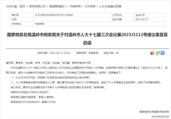 ·浙江溫嶺多位代表委員建議返還企業(yè)高管個稅,當?shù)刎敹惒块T回應:違反共同富裕原則。