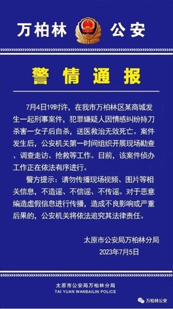 ·太原警方通報商場發(fā)生刑案:嫌疑人因感情糾紛殺害一女子后自殺。