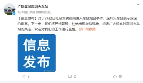 ·深圳火車站就私家車上站臺致歉:將嚴格管理,杜絕出現(xiàn)類似現(xiàn)象。