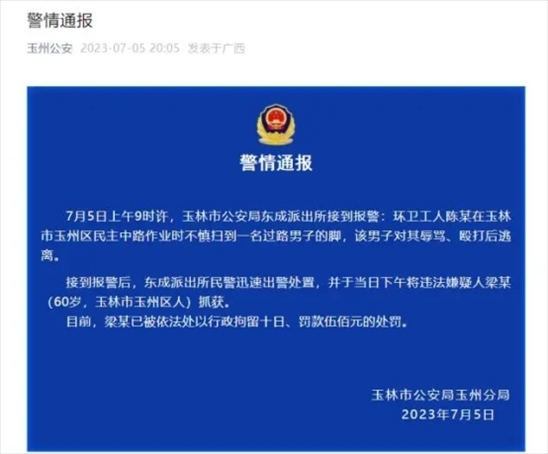 ·環(huán)衛(wèi)工不慎掃到男子腳被辱罵毆打,廣西玉林警方通報。
