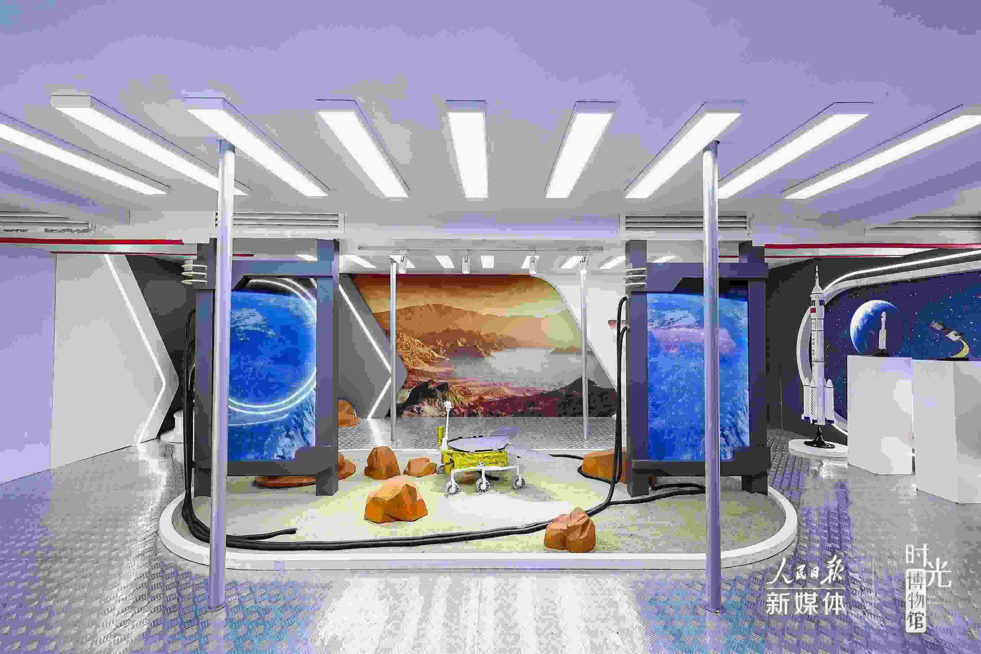 在“星辰大?!闭箙^(qū),航天器模型+視頻演示模擬真實(shí)的太空?qǐng)鼍?,?fù)古電視機(jī)循環(huán)播放過去30年的航天大事件?!吧裰邸憋w天、“天宮”遨游、“嫦娥”攬?jiān)?、“祝融”探火……將浪漫灑向宇宙,?gòu)成了中國(guó)人獨(dú)有的星辰大海。