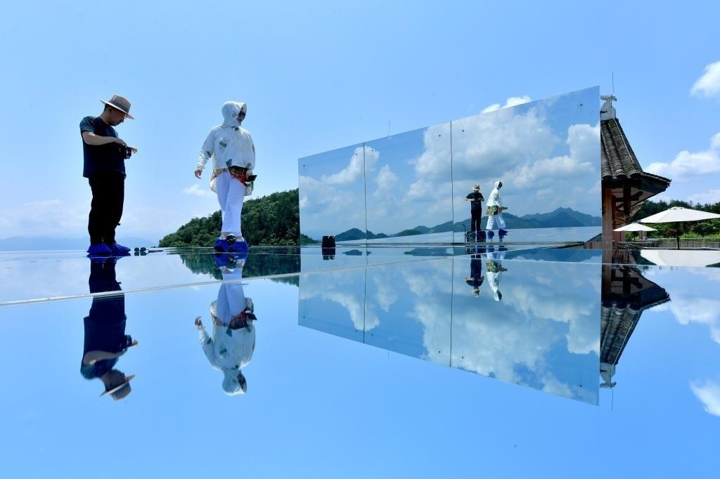 6月25日,游客在宣恩縣鑼圈巖村一處鄉(xiāng)村民宿的“天空之鏡”景點(diǎn)游玩。新華社發(fā)(宋文攝)
