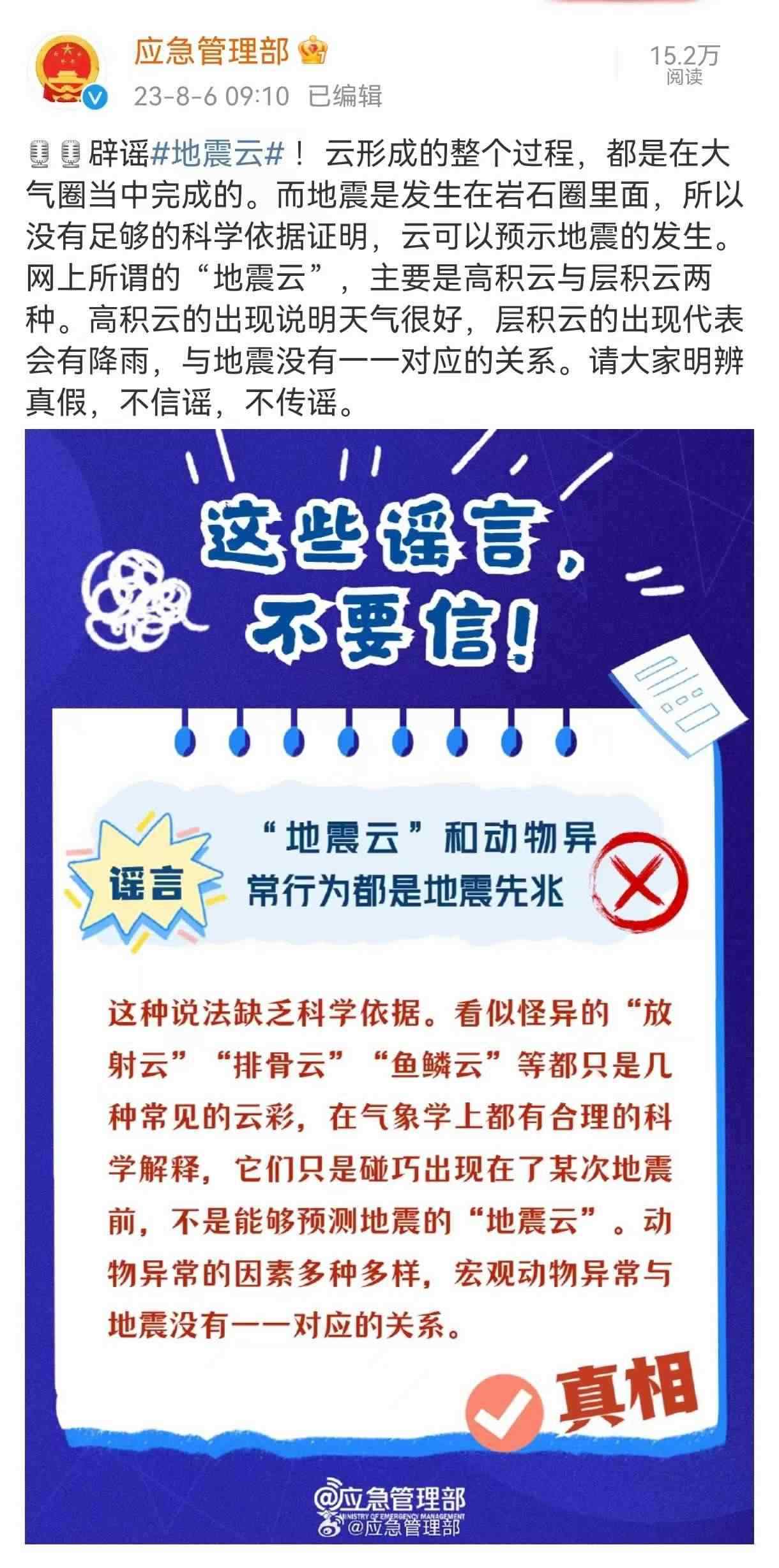 人民網(wǎng)北京8月6日電 (周靜圓)據(jù)中國地震臺網(wǎng)正式測定:8月6日2時33分在山東省德州市平原縣發(fā)生5.5級地震,震源深度10千米。地震發(fā)生后,有網(wǎng)友曬出自己拍下的云層,有關“地震云能預測地震”的說法在網(wǎng)絡上廣泛傳播。8月6日,應急管理部官方微博就所謂“地震云”相關說法進行辟謠。