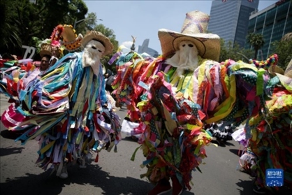 8月9日,在墨西哥首都墨西哥城,演員身著傳統(tǒng)服飾參加世界土著人民國際日慶祝活動。1994年聯(lián)合國大會通過決議,將每年8月9日定為世界土著人民國際日。