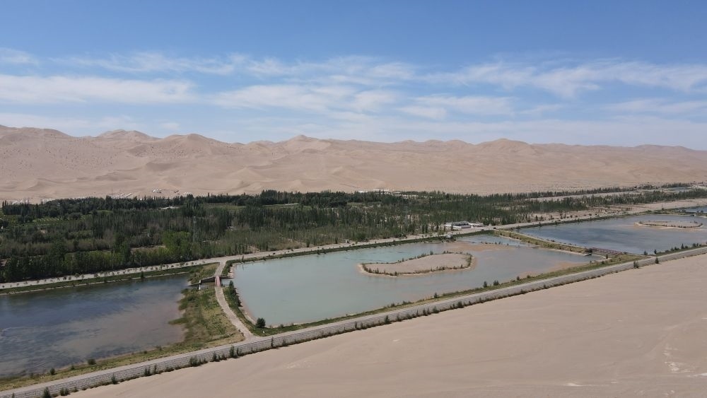 在距離月牙泉5公里的地方,有一處人稱“十二連湖”的景觀。十二個(gè)人工水池宛若明鏡,倒映藍(lán)天,時(shí)有水鳥掠過(guò)。