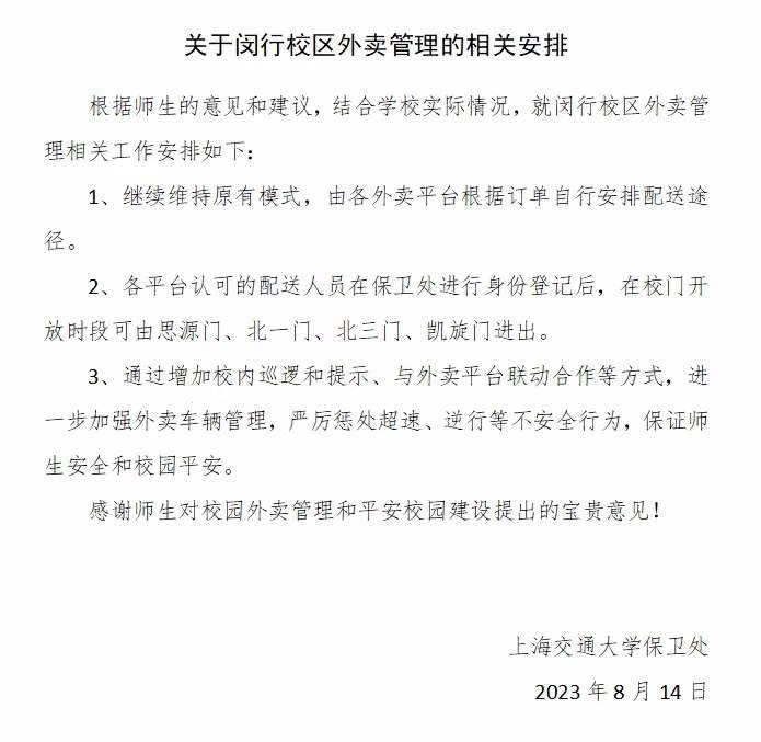8月14日晚6點(diǎn),有上海交大學(xué)生向記者反映,學(xué)校已更新關(guān)于閔行校區(qū)外賣管理的相關(guān)安排。安排顯示,維持原有模式,由各外賣平臺(tái)根據(jù)訂單自行安排配送途徑,各平臺(tái)認(rèn)可的配送人員在保衛(wèi)處進(jìn)行身份登記后,在校門開放時(shí)段可由學(xué)校四個(gè)校門進(jìn)出;學(xué)校會(huì)通過增加校內(nèi)巡邏和提示,與外賣平臺(tái)聯(lián)動(dòng)合作等方式,進(jìn)一步加強(qiáng)外賣車輛管理,嚴(yán)厲懲處超速、逆行等不安全行為,保證師生安全和校園平安。當(dāng)晚,澎湃新聞記者了解到,閔行校區(qū)已有保安人員接到上級(jí)通知,維持原有模式,多名外賣騎手也從學(xué)校保安人員處獲知可正常進(jìn)出校園。