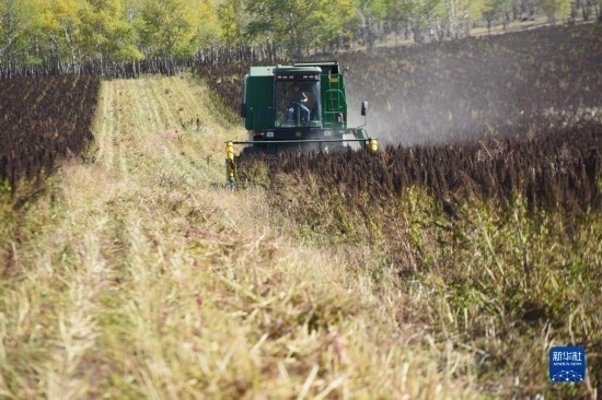 10月1日,在沽源縣白土窯鄉(xiāng)小西溝村,當(dāng)?shù)剞r(nóng)機(jī)手在操作收割機(jī)收獲藜麥。