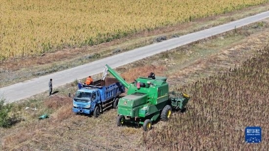 10月1日,在沽源縣白土窯鄉(xiāng)小西溝村,當(dāng)?shù)剞r(nóng)機(jī)手將藜麥裝車裝備外運(yùn)(無人機(jī)照片)。