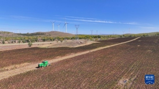 10月1日,在沽源縣白土窯鄉(xiāng)小西溝村,當(dāng)?shù)剞r(nóng)機(jī)手正在田間操作收割機(jī)收獲藜麥(無人機(jī)照片)。
