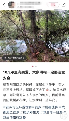10月3日,游客艾女士(化名)發(fā)布圖片稱,當(dāng)天下午2點(diǎn)左右,在鄧生溝徒步,有人照相時(shí)踩滑掉落水里,水流非常湍急。“是站在石頭上照相,踩滑了掉下去。聽(tīng)到落水者兒子哭著給家里人打電話說(shuō)的?!彼€向上游新聞?dòng)浾弑硎?,落水者是一位女游客,事情發(fā)生后,警方、消防等都在展開(kāi)救援。多位游客表示,該女游客已被找到,不過(guò)已經(jīng)去世。