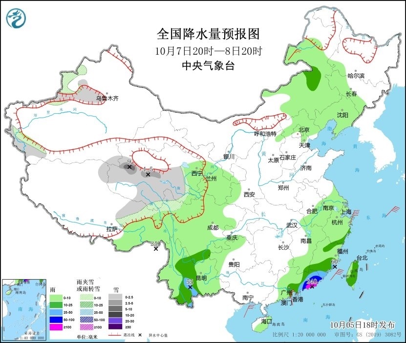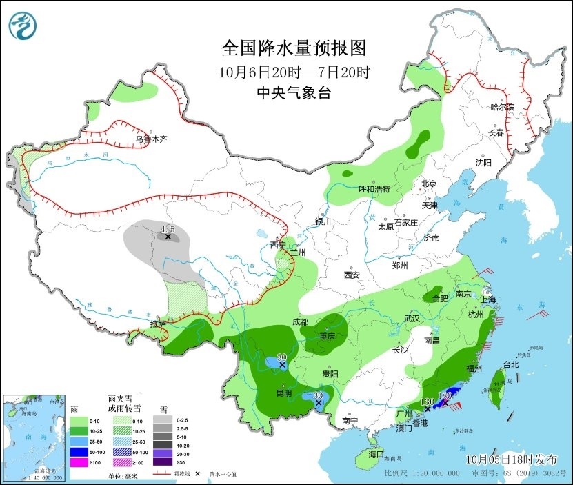 10月6日20時至7日20時,青海西南部、甘肅西南部、西藏北部、新疆西南部等地部分地區(qū)有小到中雪或雨夾雪;內(nèi)蒙古中部、浙江東部、福建大部、廣東東部、廣西西北部、云南中東部和北部、四川盆地南部、貴州北部、西藏東南部以及臺灣島等地部分地區(qū)有中到大雨,其中福建南部、廣東東部等地部分地區(qū)有暴雨,局地大暴雨(100~180毫米)。浙江、福建和廣東沿海地區(qū)有6~8級風(fēng)、陣風(fēng)9級;東海西南部及中部海域、臺灣海峽、南海東北部偏北海域有7~8級風(fēng)、陣風(fēng)9~10級,其中南海東北部的部分海域有9級風(fēng)、陣風(fēng)10~11級(見圖2)。