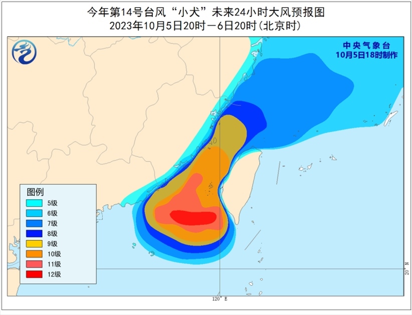 大風預(yù)報:5日20時至6日20時,東海大部及釣魚島附近海域、巴士海峽西北部、臺灣海峽、南海東北部以及浙江沿海、福建沿海、廣東東部沿海、臺灣島北部沿海將有6-8級、陣風9-10級的大風,其中巴士海峽西北部、臺灣海峽、南海東北部等地部分海域?qū)⒂?-10級、陣風11-13級的大風,“小犬”中心經(jīng)過的附近海面風力有11-13級,陣風14-15級。