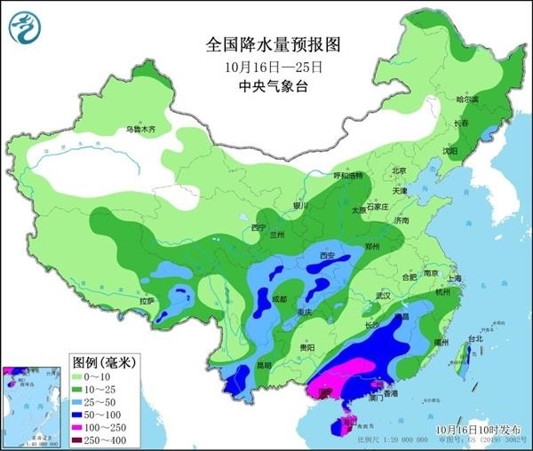 19日以后,隨著冷空氣南下,降水區(qū)域也將擴展到江南、華南等地。值得注意的是,華南地區(qū)由于水汽更充沛,再加上熱帶擾動影響,將成為強降雨中心。特別是廣西,暴雨或大暴雨將持續(xù)3至4天,這在常年10月中旬相當(dāng)少見,當(dāng)?shù)匦枳⒁夥婪冻掷m(xù)強降雨可能引發(fā)的次生災(zāi)害。