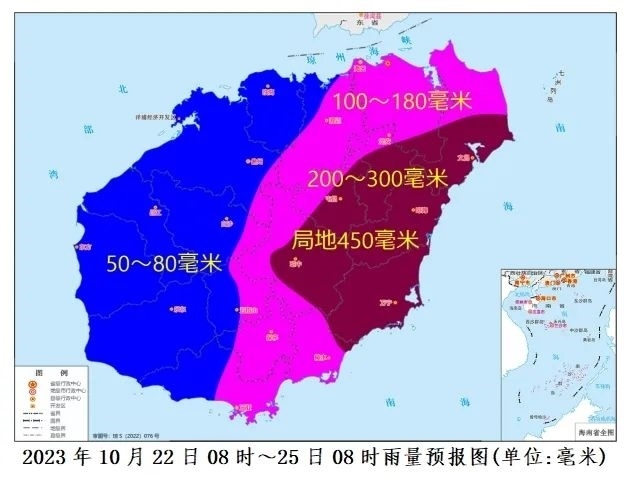 預(yù)計(jì),10月22日08時(shí)~25日08時(shí)各地累積雨量:文昌、瓊海、瓊中、屯昌和萬(wàn)寧200~300毫米、局地450毫米,???、澄邁、定安、保亭、陵水和三亞100~180毫米,其余市縣50~80毫米。