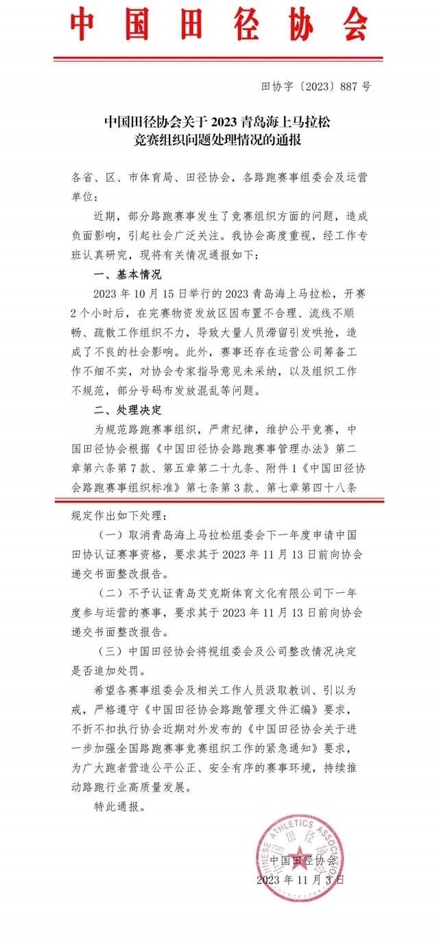 央視網(wǎng)消息:據(jù)“中國馬拉松平臺”官微消息,近日,部分路跑賽事出現(xiàn)了一些競賽組織問題,引發(fā)社會廣泛關(guān)注,造成了不良的社會影響。中國田徑協(xié)會高度重視、全面調(diào)查,依據(jù)事實和路跑賽事管理規(guī)定,從加強競賽組織,壓實各方主體責任,提示行業(yè)風險隱患的角度,對相關(guān)單位和人員進行了相應(yīng)處理?,F(xiàn)將處理情況通報如下: