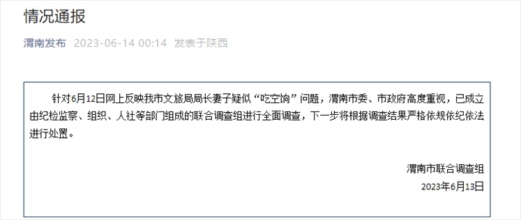 網(wǎng)傳陜西渭南市文旅局局長(zhǎng)妻子疑似“吃空餉” 官方成立聯(lián)合調(diào)查組 針對(duì)6月12日網(wǎng)上反映渭南市文旅局局長(zhǎng)妻子疑似“吃空餉......