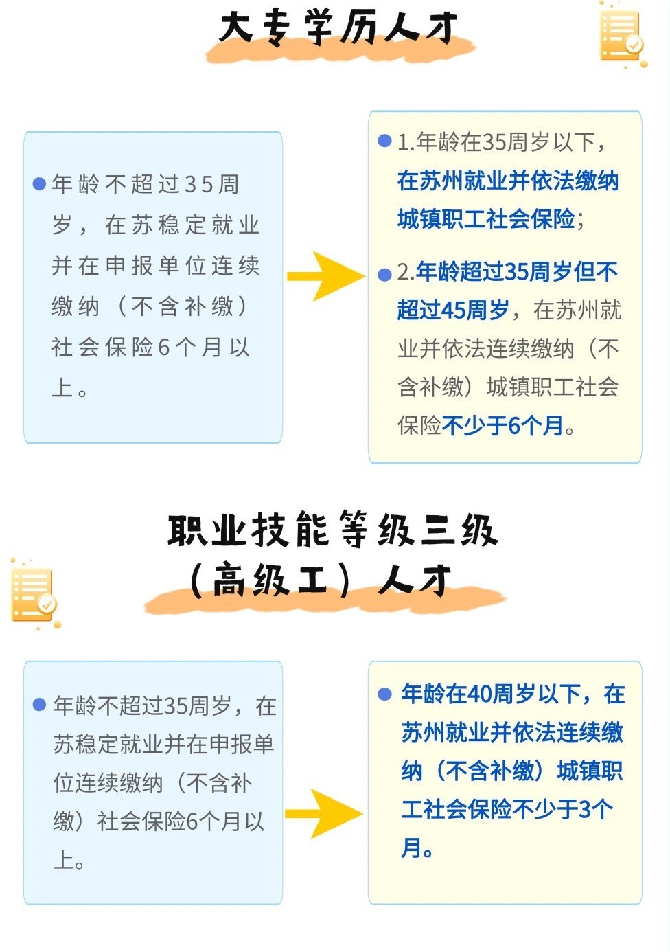 2.符合蘇州市引進(jìn)技能人才緊缺(工種)目錄的職業(yè)技能等級三級(高級工)社保繳費(fèi)年限、年齡放寬:年齡條件從35周歲放寬至40周歲,連續(xù)繳納社保時(shí)間從6個(gè)月縮減為3個(gè)月。