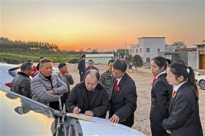 考慮到目前農(nóng)村建房施工矛盾糾紛普遍發(fā)生,為達(dá)到“審理一案,教育一片”的普法效果,近日,廣西壯族自治區(qū)象州縣人民法院石龍人民法庭干警來到象州縣馬坪鎮(zhèn)新圩村,巡回審理一起農(nóng)村建房施工合同糾紛案,并邀請當(dāng)?shù)卮迕衽月犕彙?/p>