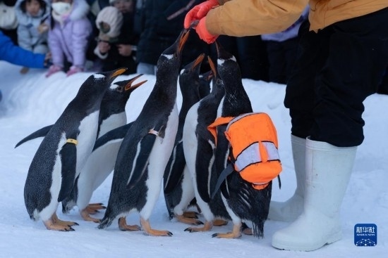 12月3日,在哈爾濱極地公園戶外冰雪巡游的企鵝吸引游客圍觀。