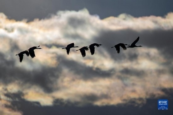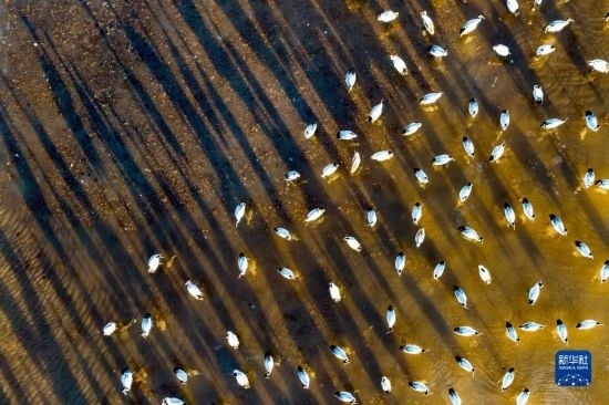 這是12月5日清晨在拉薩市林周縣虎頭山水庫拍攝的越冬黑頸鶴(無人機(jī)照片)。
