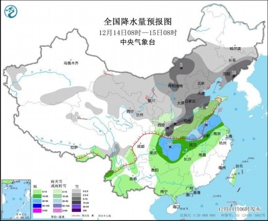 12月14日至15日,中東部地區(qū)有大范圍雨雪天氣過(guò)程,西北地區(qū)中東部、內(nèi)蒙古、華北、黃淮中北部、遼寧、吉林有小到中雪,其中陜西南部、華北南部、黃淮北部、遼寧東部、吉林東部等地的部分地區(qū)有大到暴雪,局地大暴雪或特大暴雪;陜西南部、河南、山東中部、湖北西部和東北部、安徽西部等地部分地區(qū)有凍雨;黃淮南部、江淮、江漢、重慶及江南等地有中到大雨,局地暴雨,部分地區(qū)伴有高架雷暴。