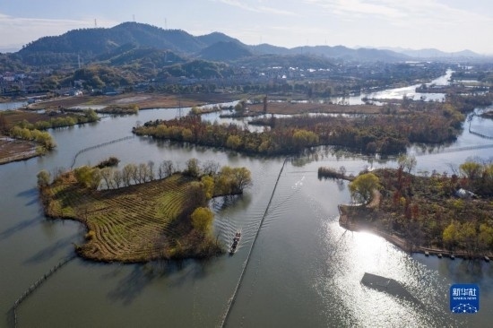 空中俯瞰諸暨市白塔湖國家濕地公園(無人機(jī)照片,12月14日攝)。