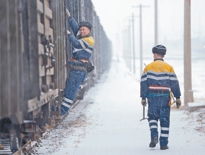 中國鐵路呼和浩特局集團(tuán)有限公司呼和浩特站調(diào)車組人員在冒雪進(jìn)行列車編組作業(yè)。 張 棖 王語欣攝影報道