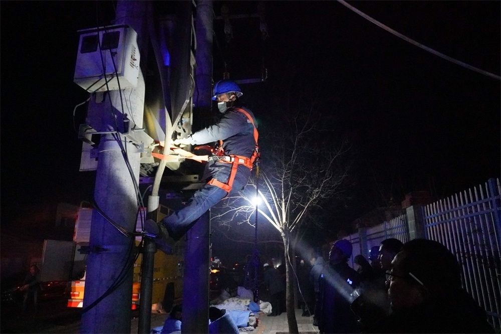 12月19日,在甘肅省臨夏回族自治州積石山保安族東鄉(xiāng)族撒拉族自治縣中西醫(yī)結(jié)合醫(yī)院門口,電力部門工作人員搶修電力設(shè)施。新華社記者 馬希平 攝