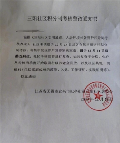·江蘇宜興一社區(qū)禁止養(yǎng)家禽,不整改將取消村級養(yǎng)老金、工作證明、入黨等福利,官方回應(yīng):撤銷通知書、廢止考核,調(diào)查處理責任人。
