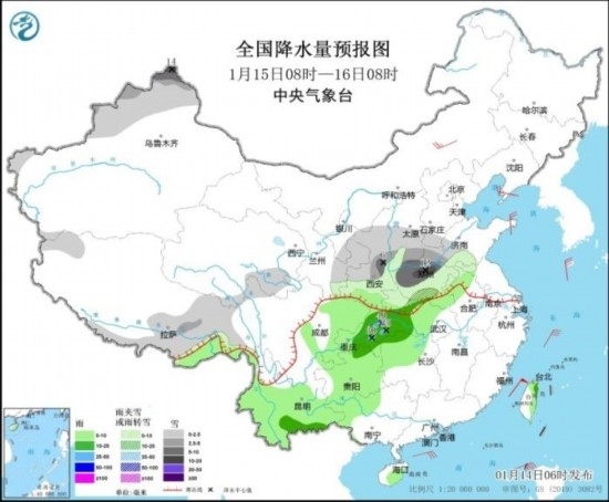 1月15日08時(shí)至16日08時(shí),新疆西北部、西藏東部和南部、青海東南部、西北地區(qū)東部、華北南部、黃淮中西部等地部分地區(qū)有小到中雪或雨夾雪,其中,新疆西北部、陜西中部、山西南部、河南中北部等地部分地區(qū)有大雪或暴雪(10~14毫米)。安徽北部、湖北中西部、湖南西北部、貴州、云南大部、廣西西北部等地部分地區(qū)有小到中雨,其中,湖北西南部、重慶東部等地局地有大雨(25~40毫米)。內(nèi)蒙古中部、遼東半島、山東半島等地部分地區(qū)有4~5級風(fēng)。臺灣海峽、南海東北部海域?qū)⒂?~7級風(fēng)、陣風(fēng)8~9級。