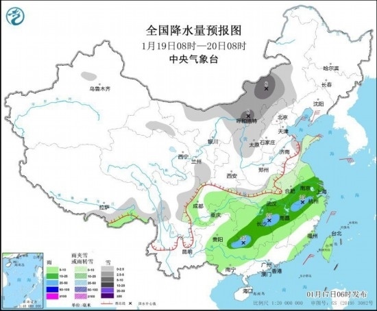 圖3 全國降水量預(yù)報(bào)圖(1月19日08時(shí)-20日08時(shí))