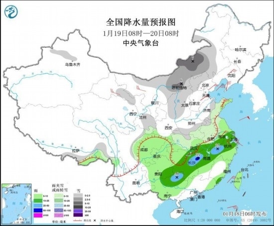 1月18日08時(shí)至19日08時(shí),新疆北部、西北地區(qū)東部、內(nèi)蒙古中西部、黃淮西部和南部、江淮北部、湖北西北部以及西藏東部等地部分地區(qū)有小到中雪或雨夾雪,局地有大雪。江淮南部、江漢東部、江南北部和西部、西南地區(qū)東南部等地部分地區(qū)有中到大雨,其中,湖北南部、湖南東北部和西部等地部分地區(qū)有暴雨(50~60毫米)。內(nèi)蒙古東南部、遼寧大部、華北東部、山東半島、江南東部等地部分地區(qū)有4~6級(jí)風(fēng)(見(jiàn)圖1)。