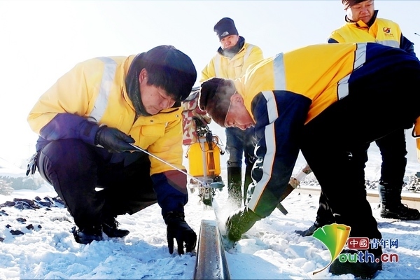兩臺超聲波鋼軌探傷儀,在身穿橙黃色工作服的探傷工的推行下,緩緩向線路遠(yuǎn)方走去。寒風(fēng)中,探傷工們從頭到腳的防寒裝備也為他們在冬季室外作業(yè)提供了保障。