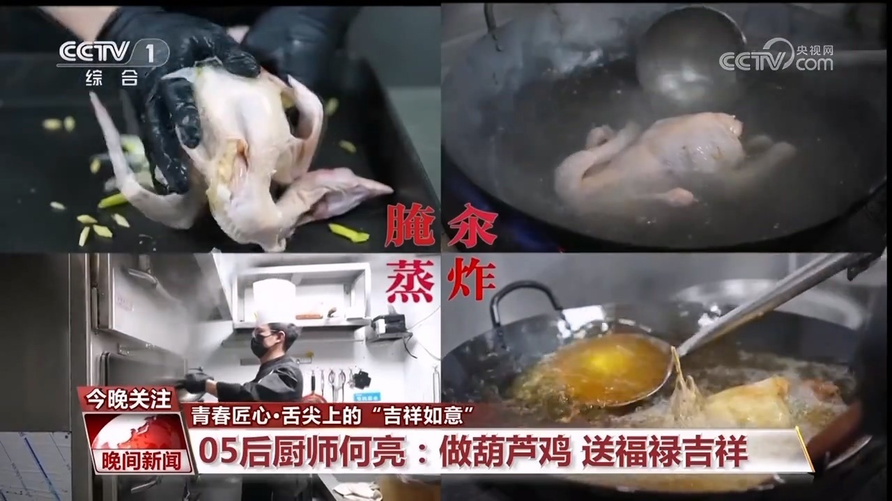 葫蘆雞,是陜菜的代表性菜品之一,相傳始于唐朝并一直流傳至今,因其形似葫蘆而得名,也有諧音“福祿”之意,深受喜愛。香味濃郁的葫蘆雞,是05后廚師何亮的拿手菜品。