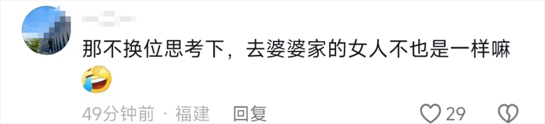 還有網(wǎng)友表示,這個(gè)時(shí)候,女婿更應(yīng)該能過(guò)體諒媳婦在婆家過(guò)年的難處了,大家過(guò)年要互相體諒,換位思考。