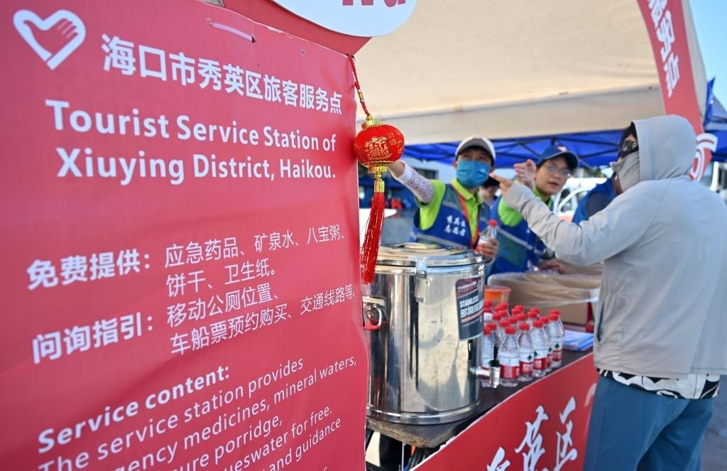 記者在新海港附近一處旅客服務點看到,幾位志愿者在向旅客發(fā)放免費礦泉水和餅干。