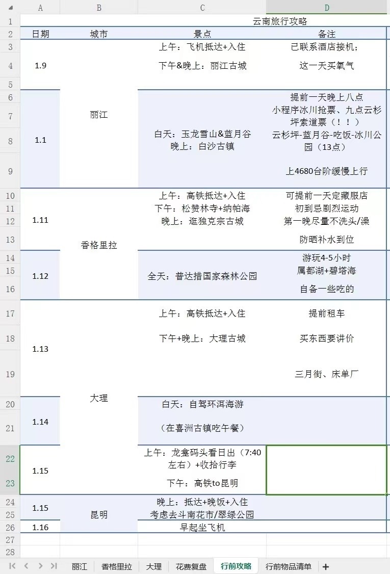 這個(gè)冬天去云南旅行前,周玫將自己的計(jì)劃制成一張excel表格,具體到每個(gè)市、每個(gè)景點(diǎn)、每種美食……旅行結(jié)束后,她還對(duì)云南游的具體執(zhí)行情況進(jìn)行了復(fù)盤總結(jié),在社交平臺(tái)上分享給她的“電子驢友”。