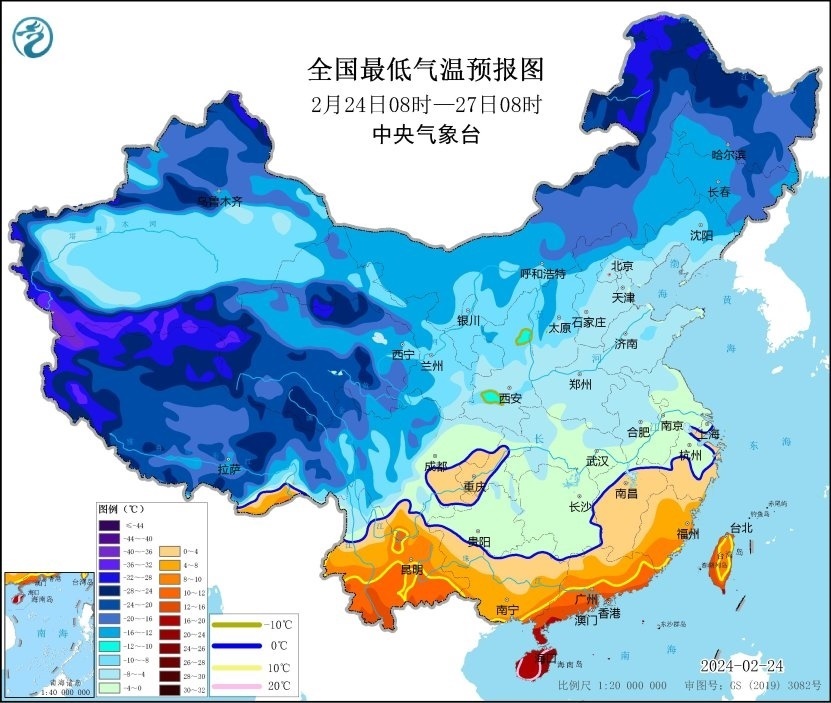 預(yù)計(jì),2月24日08時(shí)至27日08時(shí),江淮中西部、江漢大部、江南中部和西部、西南地區(qū)東部和北部、廣西、廣東北部以及陜西東南部、甘肅東南部、新疆沿天山地區(qū)、西藏南部等地的日平均氣溫較歷史同期偏低5℃以上,其中,湖北中部和南部、湖南大部、江西中部、貴州大部、廣西中北部、四川中西部、新疆沿天山地區(qū)等地的日平均氣溫較歷史同期偏低7℃以上,最低氣溫0℃線將位于貴州西南部、廣西北部、江西北部至江蘇南部一帶。